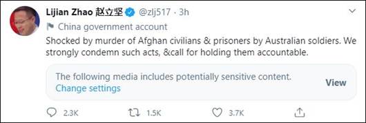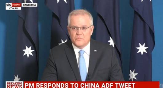 在赵立坚推特发出仅2小时后,莫里森公开宣称,这幅"令人反感的"(repugnant)推文,包含一张"伪造的"图片,意指本国士兵用到威胁一名孩童,是中国外交部副部长用官方推特账号发布的,这种行为"令人震惊",所有澳大利亚人、澳大利亚士兵都觉得被深深冒犯(deeply.offensive)。