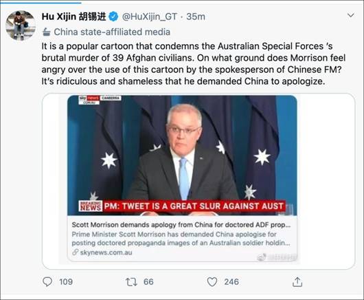 《环球时报》总编辑胡锡进转发莫里森言论反驳道,"这幅广泛流传的画作谴责了澳大利亚特种部队残忍谋杀39名阿富汗平民。莫里森凭什么因为中国外交部发言人使用这幅照片而感到愤怒?他要求中国道歉,简直荒唐可笑,厚颜无耻。"