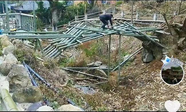 桥横跨在 20 米宽的河涧上,从基底到桥梁,都用竹子支撑,用了 1000 多根竹子。建桥时是冬天,山里气温都在零下,王家乐先花了一天除杂草、清理多余的石头,再排一排 20 米长的竹竿搭起横梁,利用横向和斜向下穿插的竹竿,形成一个三角结构的拱桥,支撑在两岸,再用纵横拼接竹子加固桥面。