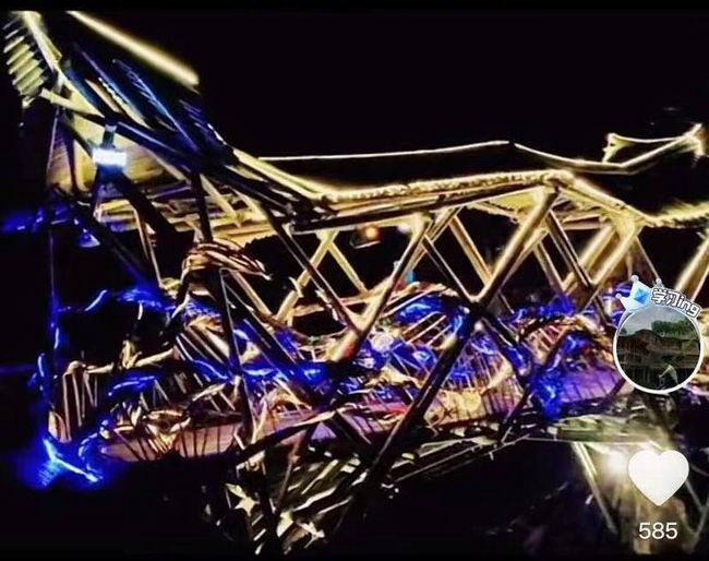 竹桥在夜里亮起来的效果。