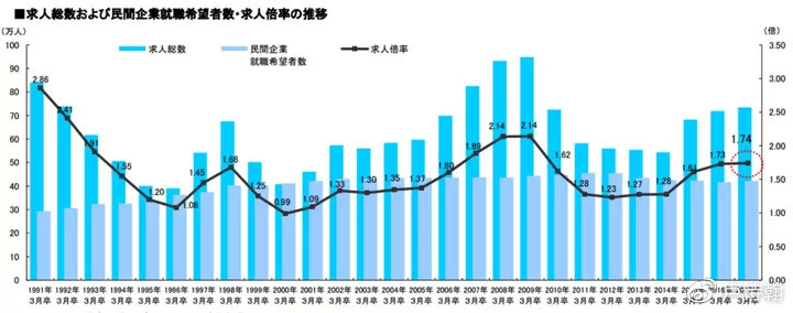 1991.年,日本企业求人数和最终录取数比例是.2.86(日本的求人数可理解为我们的.offer,发出的签约意向书)也就是说,大学毕业生一毕业,有.2.86.家公司岗位在等着。