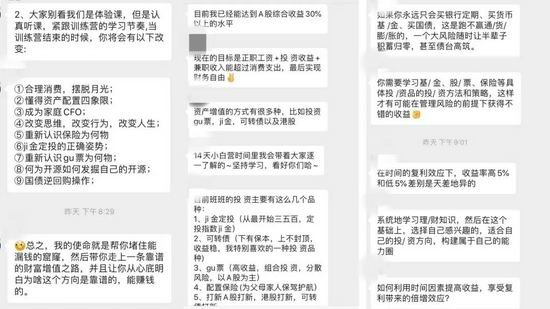 这些机构的普遍做法是,先拿引流的产品吸引用户进群,讲授一些理财的基础知识,之后用各种电话、微信消息推销,用大幅度优惠诱导,辅以学员赚钱案例,如果用户称没钱,还能用花呗、京东白条等支付。