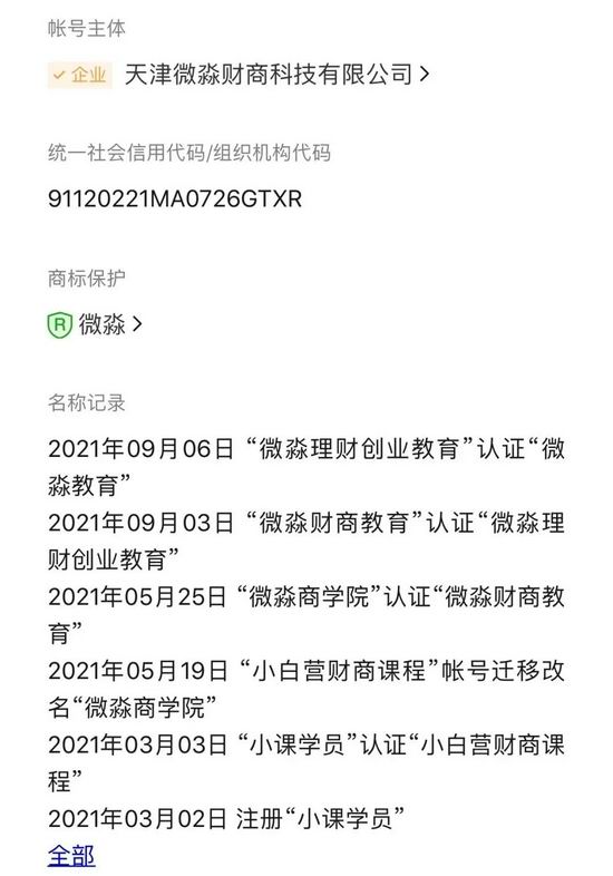 微淼的几次改名也能看出其转型之路,仅仅在 9 月份,它的认证名称就改了两次,从财商教育改成理财创业教育,再到范围更笼统的 “教育”。