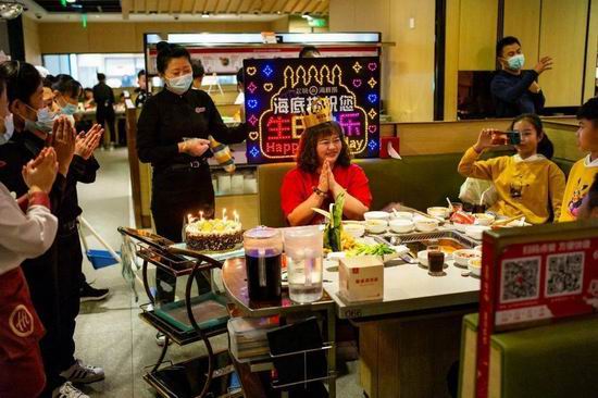 ▲.海底捞员工给顾客送上生日祝福。图./.视觉中国
