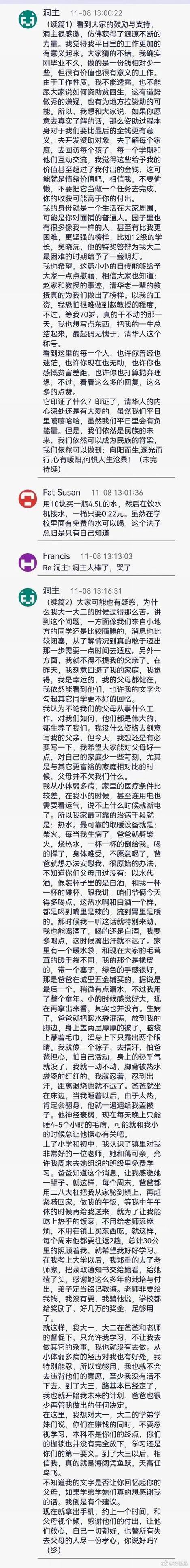 @林饭恩:在朋友圈看到这个帖子。转发自清华树洞,一位曾经领取国家助学金的同学,分享自己一路走来的经历。身体力行什么叫「自强不息,厚德载物」,很让人感动。 ​​​