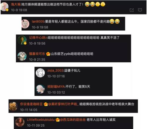 最早这些节目的片段是微博搞笑博主的一个数据反馈很好的更新素材,动辄五百多万次观看,近一万多评论,套用到各种.emo.情绪或者时下流行的网络流行语当中,比如."我老了可能也会去相亲"、"大爷怎么不照照镜子"、"大妈人间清醒"、"社交牛逼症"。