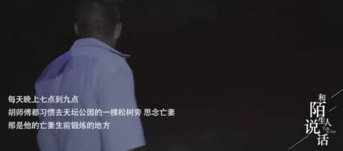 胡大爷每天都去天坛公园,那是他之前和妻子一起晨练的地方,经过一棵松树的时候他忍不住开始抹泪,胡大爷说妻子之前一直爱把包挂在这棵松树上面,说完也把自己手里的包挂了上去,像是和妻子来一次错位的重逢,女儿此时打来电话,胡大爷亮起的手机屏保正是是这棵松树。