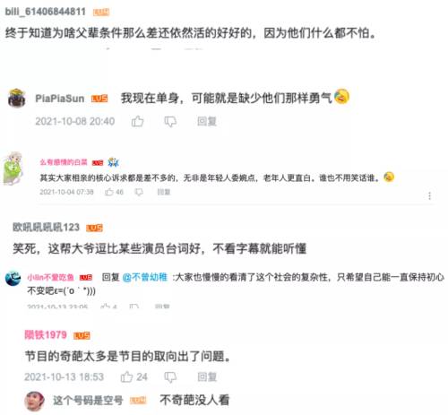 网友们似乎也很难接受."中老年人恋爱".以."喜剧".之外的形式出现,也很容易让人们疑惑大家到底缺乏."快乐源泉",还是真的对."中老年人恋爱需求".这个社科命题进行关注。2018.年腾讯视频推出的纪实访谈节目《跟陌生人说话》中的."菖蒲河老人情".一集的评论区和弹幕就显得非常典型。