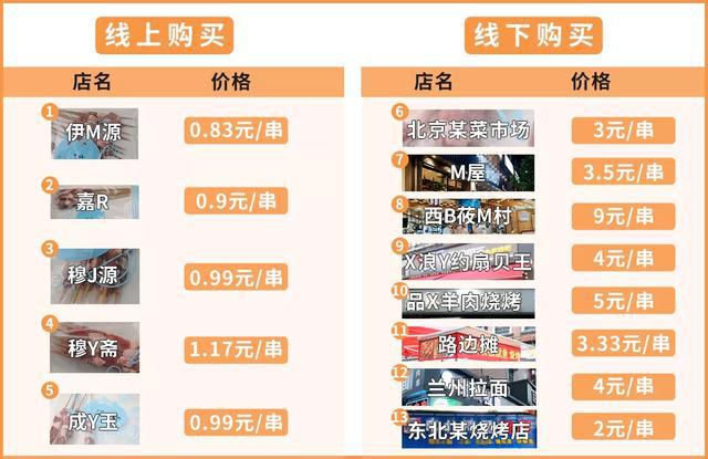 为了让大家能够放心撸串,我们买了.13.款羊肉串,其中线上买了.7.款,线下买了.5.款。