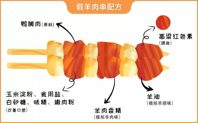 据说市面上的假冒羊肉串,大多数都是鸭肉仿造的。鸭肉相对便宜,是常见畜禽肉中成本最低的,而且色泽偏暗,接近羊肉的颜色。只要加上一点儿羊肉香精和色素,就可以骗过大多数人。用它造假,可以说是性价比最高的选择了。