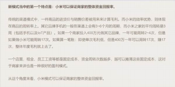 大家都知道小米的硬件产品利润率很低,但是小米的资金效率会有一种不同的算法:毛利率低,但周转率高:100.万如果投在小米门店上,一年可以运转十几次,所以小米整体的投入回报率要高于其它的品牌。(有兴趣的读者朋友可以再回看一下懂懂上一篇《小米线下渠道:错过了什么,悟出了什么,再造了什么?》)。