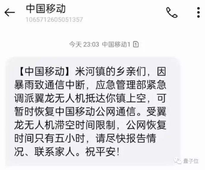 因为这条短信是在断路、断电、断网的情况下,通过.1.架无人机,直接发到当地居民手机上的。