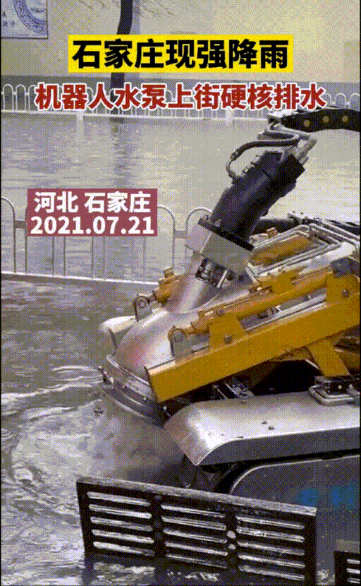 在石家庄街头,这个机器人水泵上街作业,快速排走大量路面积水,工作人员只需在一旁遥控操作即可。