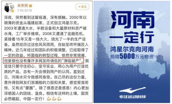 上周,鸿星尔克因为向河南灾区捐款.5000.万而一夜爆红,理由是鸿星尔克自身尚处于亏损中却仍然慷慨解囊."倾小家为大家"。鸿星尔克总裁吴荣照给出了回应,表示鸿星尔克处于转型时期,"虽然非常艰难,但还没有像网友调侃的那样."濒临破产"。