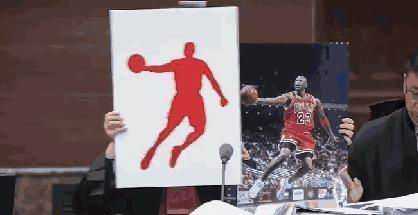 代理律师拿着迈克尔?乔丹的经典照片与乔丹体育..使用的图片商标作对比.蒙板脱落后二者轮廓完全重合
