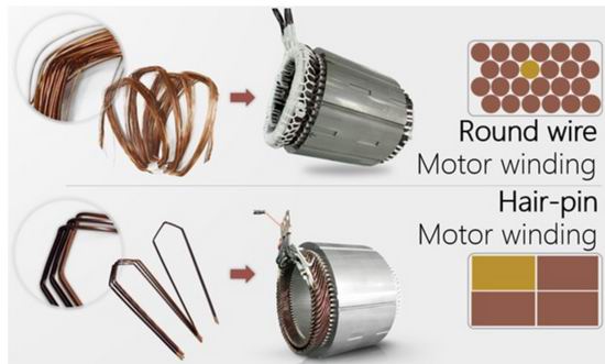 扁线电机,简单来说就是将传统电机缠绕的铜线从圆线变为扁线,以提升电机的功率密度。