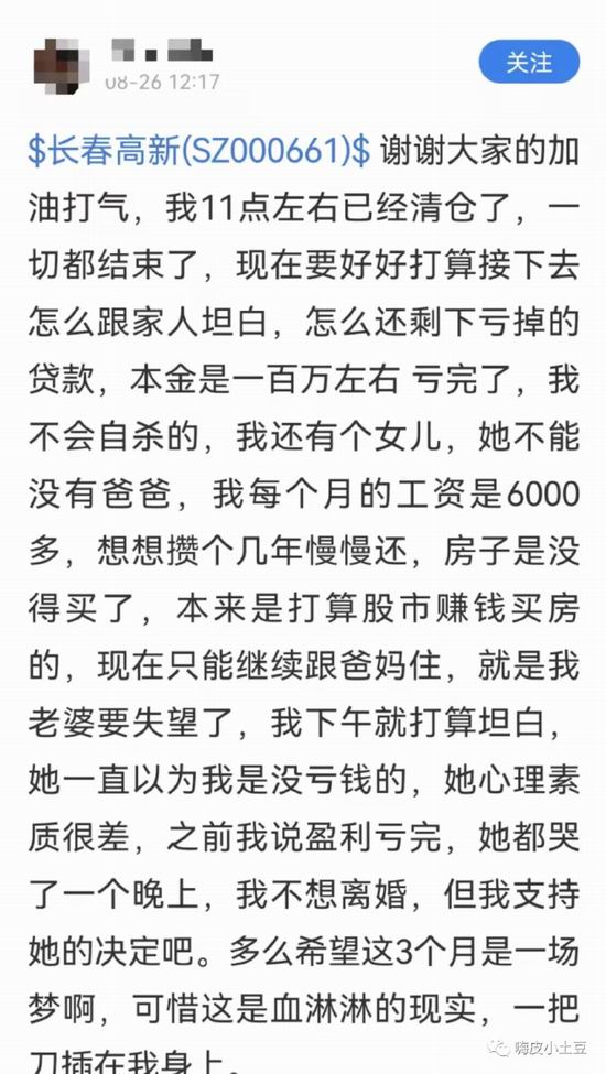 很多人都达不到 A 股开通融资账户的条件,而去银行、亲戚朋友那里借钱。比如前段时间被许多财经媒体转载的某雪球用户,因为加杠杆买了长春高新,而且是向银行借的钱,可能是消费贷之类的吧,因为银行不可能借钱给你去炒股的。这个朋友 100 万本金已经不少了,本来是想赚一波,然后买房子,结果遇到了长春高新腰斩,不仅 100 万本金亏没了,借的银行几十万还是要还。