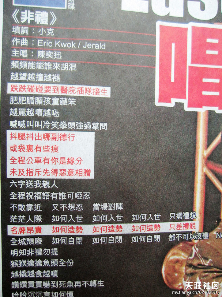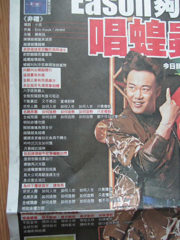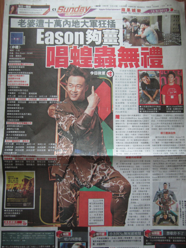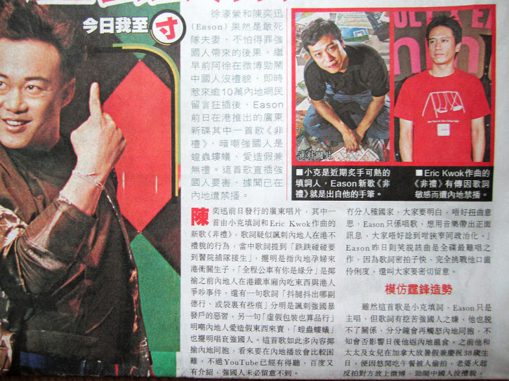 (香港讯)陈奕迅够大胆,唱蝗虫无礼。继早前老婆徐濠縈在微博骂中国人没礼貌,即时惹来逾10万中国网民留言狂插后,Eason前日在港推出的广东新专辑其中一首歌《非礼》,暗嘲强国人是蝗虫螻蚁、爱造假兼无礼。甚至明讲中国孕妇到港插队接生,还揶揄当地人在香港地铁车厢内吃东西,还与劝阻的港人吵架的事件,这首歌直插强国人要害。这是Eason第一次当老板发行的专辑,却胆敢跟自己的荷包过不去。据闻,这首歌已在中国遭禁播。