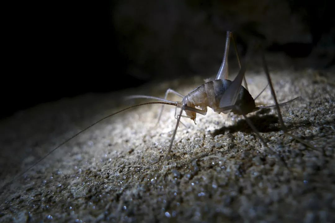▲ 大石围天坑内10万多平方米的坑底森林里,隐藏着另一个世界。从左至右:大石围金线鲃、蝙蝠、中国溪蟹、洞穴灶马、张氏幽灵蜘蛛。摄影/李晋