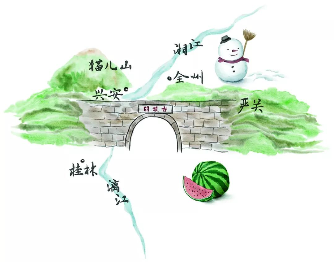 ▲ 严关地区位置示意。广西南北气候存在巨大反差:最冷的一月份,当严关以北的兴安、全州、资源等县冰天雪地,北海的银滩上还有不少人身穿泳衣戏水踏浪。绘图/文一