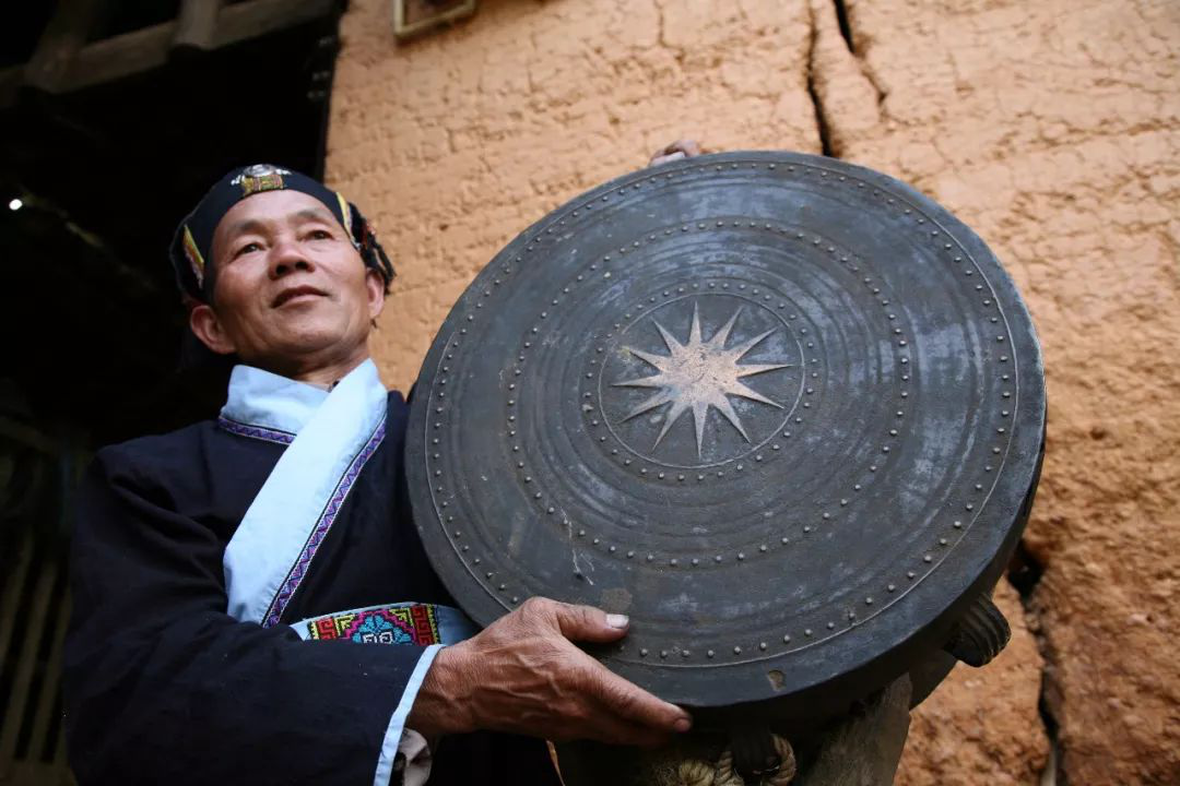 ▲ 国家级非物质文化遗产名录项目——“田林瑶族铜鼓舞”代表性传承人班点义从屋里往外抬着一面铜鼓。摄影/梁汉昌