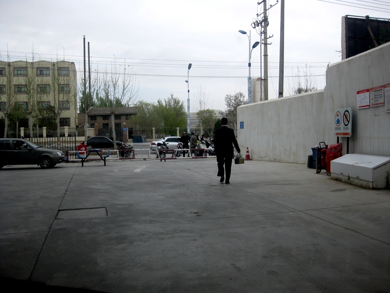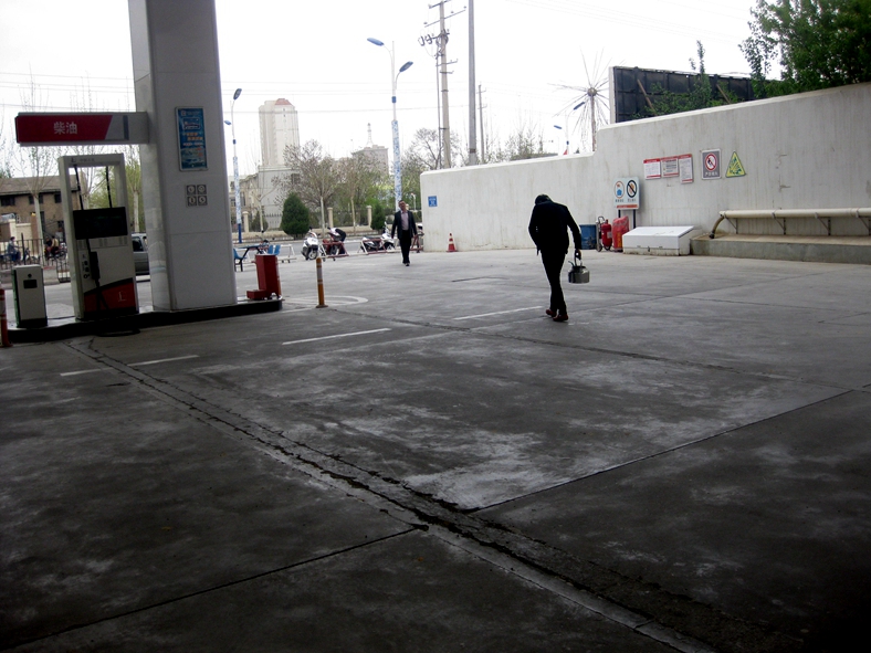 摩托车要在站外停放,自己拿水壳到油机加油,再拿出站外加入车。