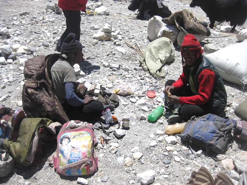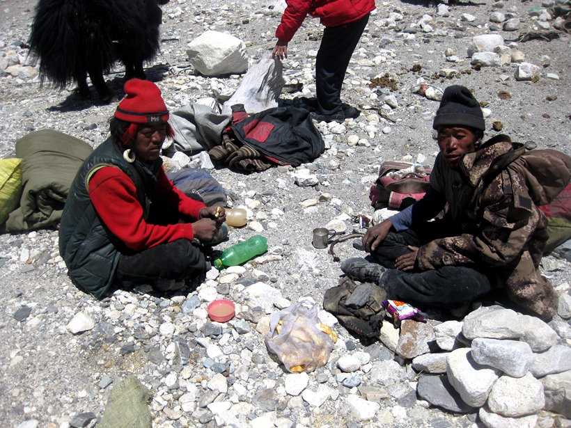 不是三无人员呀,除兵哥、游客、商人外,就是为大本营运送供给的藏民。这两个藏民正在用午餐,还很客气请我坐下来一起饮他们带上来的酒。