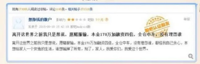 但如果我们去看当年的细节就会发现,这个人是在.2014.年下半年入市的,享受了前面一段牛市,170.万很多都是在牛市里赚到的钱。结果一波大跌不仅亏掉了本金,可能还欠下了配资公司一屁股债,再加上家庭的压力,精神一下子就崩溃了。