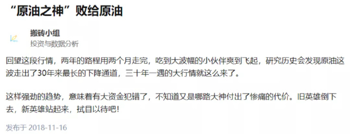 一是在.2018.年.11.月,油价爆跌的时候,聊了聊我们的看法。当时国际油价不到两个月就跌掉了四分之一,这样的跌幅和速度几十年没见过了。原油是大宗商品之母,对投资的重要性不言而喻。历史上原油大起大落,不少明星交易员和投资公司也随之升起和陨落。