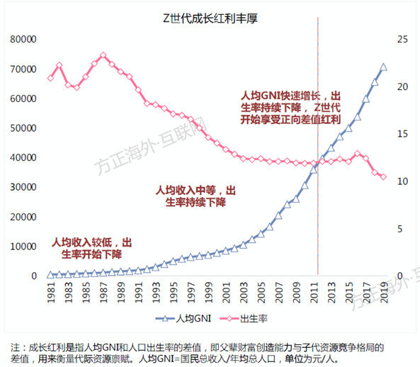他们的资源禀赋和可支配收入是增长的,但是问题是涨不过房价,这里陷入了一个尴尬的境地:如果涉及买房育娃,那么收入的增长杯水车薪;但是如果不涉及买房育娃,由于人均 GNI(也就是人均可支配资源)在稳步提升,他们的收入又是很充裕的。
