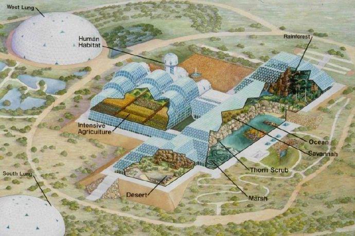 这是一次为期 2 年的活人实验,他们需要在这座完全与世隔绝的小地球中依靠自给自足生存下来。封闭的建筑中生存着数千种动植物与微生物;所有空气和水都是内部循环的,实验期间不能获取任何补给;唯一与外界有交集的有只有透过玻璃进入室内的阳光与温度。