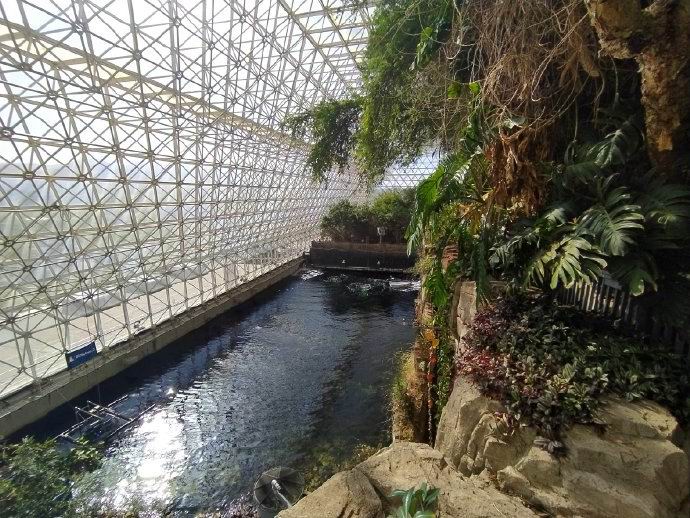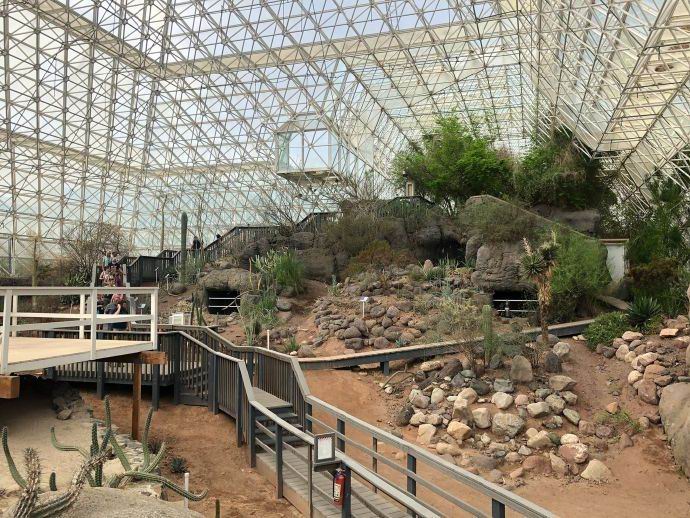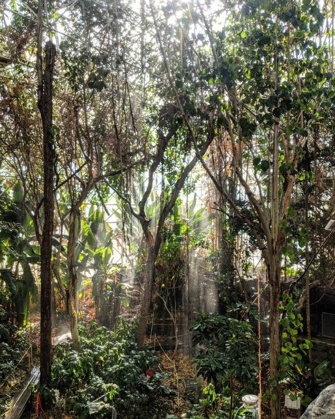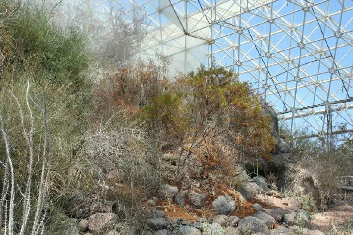 整个计划的背后并没有官方背书,发起者只是一些激进环保团体、疯狂科学家和诗人,旨在探讨火星殖民的可行性以及计划长达百年的生态实验。在亿万富豪的资助下,最终在 1987 年到 1989 年间建成了这座占地一万二千平方米的巨形玻璃建筑,大到足以在其内部容纳 5 个生态系统 —— 海洋、雨林、沙漠、沼泽地和稀树草原,以及一小栋为 8 名志愿者起居生活做实验的房子。