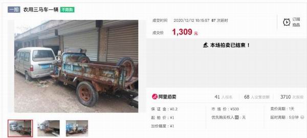 这辆天秀三轮车市场价.500.元,起拍价.1.元,有.41.位好汉参与了竞拍。最后以.1309.元的价格成交,不知道又是哪位幸运儿喜提了这辆三轮车。