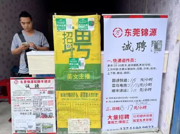 东莞街头随处可见招聘信息,工时费普遍在 15 元到 19 元每小时。摄影:张楠茜