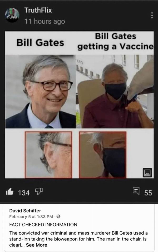 当比尔?盖茨在网上放出自己接种疫苗的照片时,有人甚至通过与以往照片的对比认定打疫苗的比尔?盖茨是个替身,因为耳朵长得不一样。