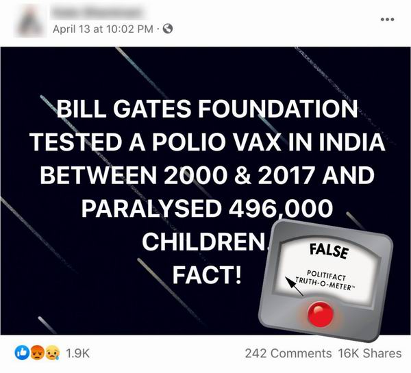 印度人中一度传闻盖茨基金会在十七年间用印度人测试小儿麻痹疫苗,结果导致了超过.49.万名儿童瘫痪。