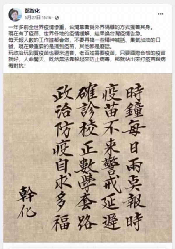 当局拒绝国台办提供疫苗的喊话,郑智化一眼看穿其中政治把戏: