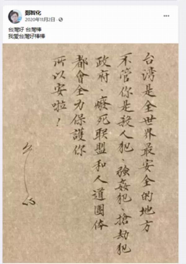 台湾是全世界最安全的地方,不管你是杀人犯、强奸犯、抢劫犯,政府、废死联盟和人道团体都会全力保护你。