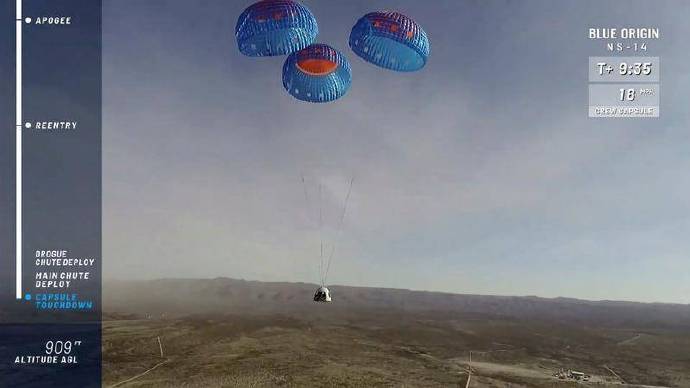 今年 1 月,蓝色起源公司在美国德克萨斯州试飞后,使用降落伞着陆。图片:相关视频截图