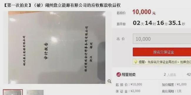 据淘宝网.-.司法拍卖显示,湖州鼎立能源有限公司管理人将于.2018.年.12.月.23.日.10.时至.2018.年.12.月.24.日.10.时,在浙江省湖州市吴兴区人民法院人民法院阿里巴巴司法拍卖网络平台上进行公开拍卖活动。拍卖的这件产品是湖州鼎立能源有限公司享有的债权.15.户应收账款共约.36636670.10.元。