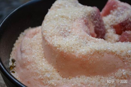 压上一两天,容器里就会有约莫小半容器汁水,把水倒干,把肉翻一翻,再炒半斤粗盐,抹在肉上,压上重物,腌一两天。