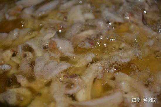 处理干净的肉小火慢炸把油烤出来,时不时要给肉翻面,烤到泛金黄。这步用柴火尤其耗时,很考验我耐心。