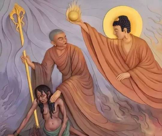焰口经来自汉传密宗,焰口又叫 “面然”,全称 “面然大士”,是一种饿鬼的名字,也是藏传佛教密宗瑜伽部供奉的主尊之一。佛教认为,人死后进入天人、阿修罗、人、畜牲、饿鬼、地狱这六道中轮回,畜生、饿鬼和地狱称为 “三恶道”,做了坏事才会堕入其中受苦。饿鬼道中存在着各种饮食,但饿鬼生前作恶而无法吃喝,永远是吃不饱且饿得要死的状态。