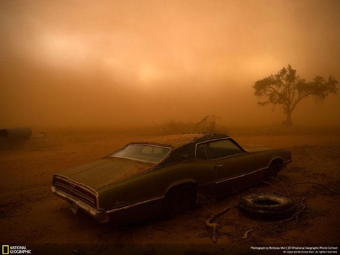 2、「尘土中的雷鸟」,一辆生锈的福特雷鸟被德克萨斯州一场龙卷风带来的红尘覆盖,风暴以每小时90英里的速度掠过这片土地并将土壤沉积在更远的南方;