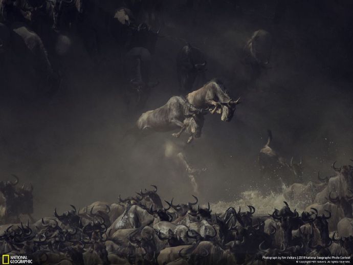 4、「飞跃河流上空」,坦桑尼亚马拉河的角马争先恐后的渡河,尖锐的牛角、溅起的水花和雄壮的躯体使这幅场景显得充满刚烈之气,如同古典风格的油画那样令人难忘;