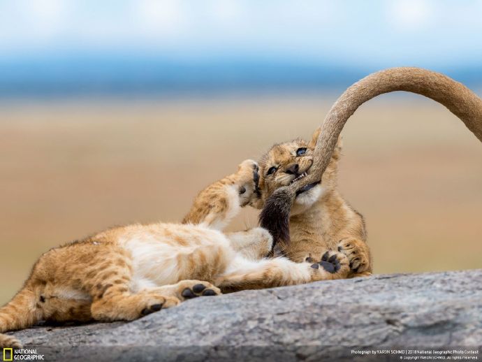 6、「幼儿的牙齿」,两只狮子的幼崽在玩耍时咬住母亲的尾巴,就像是家养的猫对毛线球产生兴趣那样;