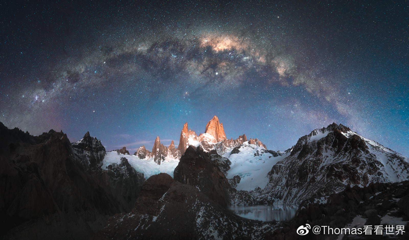 我和队友凌晨4点从营地出发,在7点达到了Fitz Roy峰的最高观景点。此时日出前太阳的折射光已经把山峰打亮,同时银河移动到比较低的角度,我们得以5张竖构图拍下了这张银河接片,此时山峰已经被地平线下的太阳折射光照红。