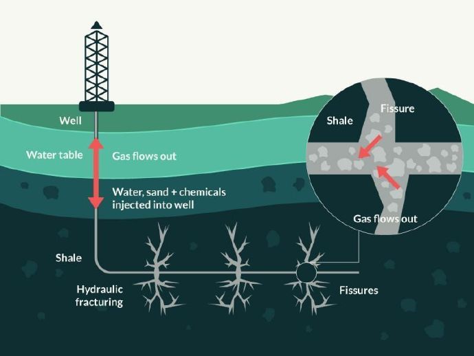 这是一种近20年才大规模兴起的石油和天然气挖掘技术。简单来讲,就是用水把石头给挤破,让页岩里渗着的油和气跑出来。