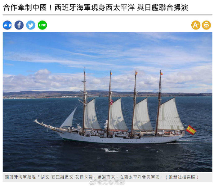 美国和日本在太平洋军演,理由是 “围堵中 & 国 & 军 & 事 &* 扩张”,日本为了扩大合作对象,强力邀请西班牙也参演,西班牙估计不想参合这事儿,但又不想落了美日的面子,于是派出了一艘帆船……(@无心简影)