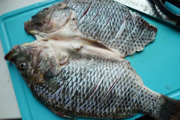 1、罗非鱼从背部剖开,洗干净,两面打上花刀。